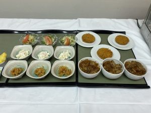 基本メニューはご飯・味噌汁・小サラダ・小鉢2品・お新香・ミニデザートの7品で、下記の8品は日替わりで8品のうち3品ずつのご提供となります。